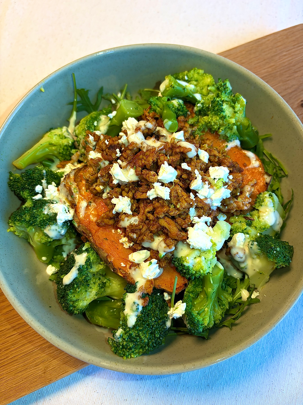 Snijd de zoete aardappel doormidden en werk af met het gehakt. Serveer met de yoghurtdressing en broccoli. Verkruimel de feta erover.